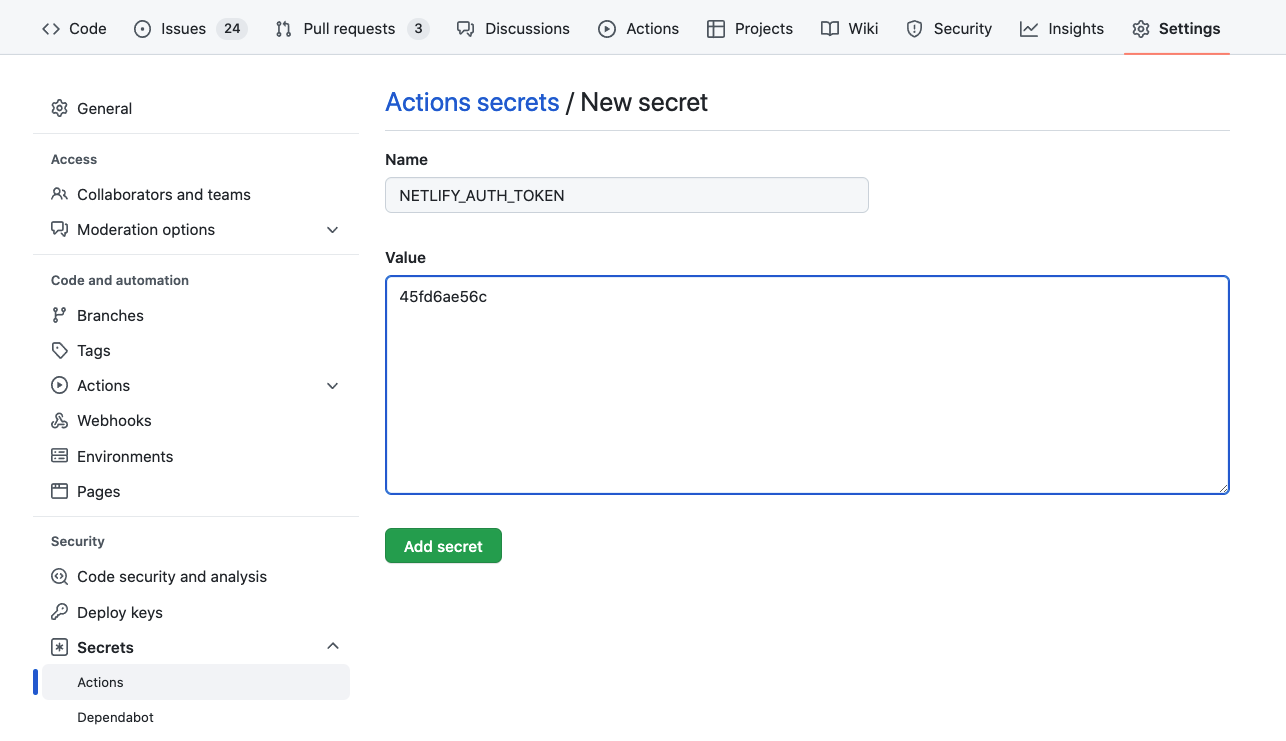 Add the Netlify personal access token to your repository’s action Secrets (accessible within repository Settings). You will see a New repository secret button at the top right: