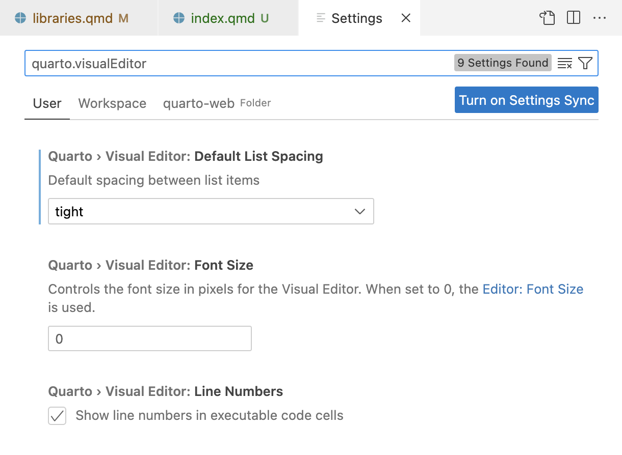 There are a variety of Positron options available to configure the behavior of the visual editor. You can locate these options by filtering on quarto.visualEditor